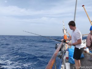 Nachdem wir am Morgen wie immer gefrühstückt haben, war es an der Zeit die Segel (Breitfock) zu bergen. Etwa um 12:00 Uhr haben wir dann nach fast einer Woche auf See wieder im Hafen fest gemacht, dieses Mal aber nicht in Europa, sondern in der Stadt Mindelo auf der kapverdischen Insel Sao Vicente. Nachdem wir sicher im Hafen lagen, durften wir ziemlich überraschend direkt in die Stadt, um uns einen ersten Eindruck von der Qualität der Pizzerien zu machen. Als sich dann alle Schüler*innen (natürlich pünktlich wie immer) an Bord eingefunden hatten, fand noch eine kleine Schüler*innen-, Lehrer*innen- und Nathalie-Versammlung statt, bei der wir den Plan für unsere Zeit auf den Kap Verden besprochen haben.
