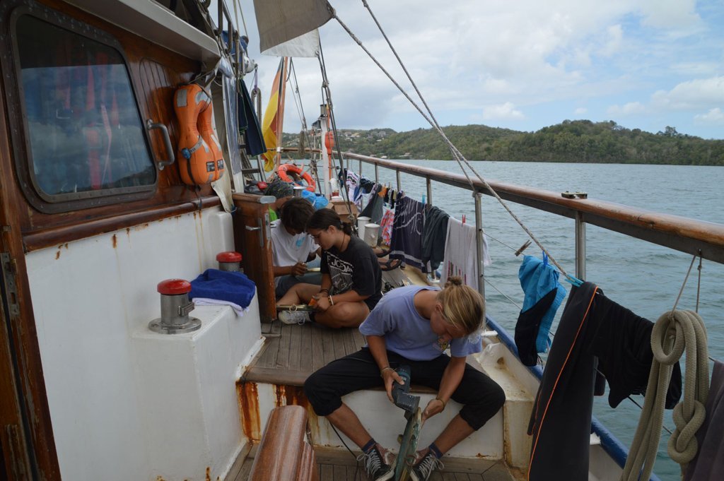 Also fangen wir mit Decksarbeiten und Landgang am Samstag, den 13.03. an: Nachdem auch die letzten Schlafmützen aus ihren Kojen gekrochen kamen, war es endlich Zeit für´s Frühstück. Allerdings gab es nichts nennenswert Besonderes zum Fuddern. Beim Essen wurde uns dann noch eröffnet, dass wir doch noch an Land können (natürlich mit Corona Test vorher), worüber wir uns alle unglaublich dolle gefreut haben! Direkt nach dem Frühstück wurden wir von Tim und Siggi zu Decksarbeiten und Großreinschiff eingeteilt. Wir bemühten uns, die anstehenden Arbeiten so schnell wie möglich zu erledigen, da wir alle sehr motiviert waren, endlich Martinique zu erkunden. Die Steuerbordgruppe sollte unter Deck vorne und achtern putzen. Die Backbordgruppe (also meine und Selmos Gruppe) wurde für Decksarbeiten eingeteilt. Anselminsky und ich haben gemeinsam den Bootsmannstore aufgeräumt. Für alle Landratten, die nicht wissen, was damit gemeint ist: Der Bootsmannstore ist ein Raum, in welchem alle Ersatzteile wie Schäkel, Stagreiter, Blöcke etc. aufbewahrt werden. Haha, jetzt kann es natürlich sein, dass ihr auch nicht informiert seid, was Schäkel und Stagreiter sind, aber was soll´s… Dazu hat uns Siggi erläutert, was wir alles machen sollten.