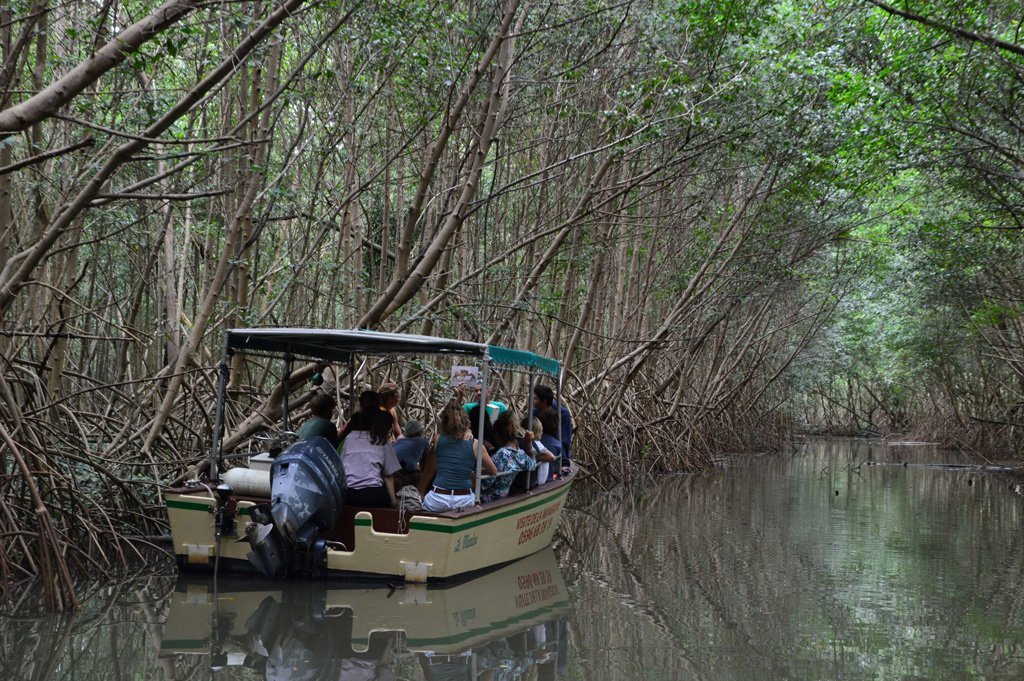 Gutennnnn Morgen! Ausnahmsweise durften wir mal ausschlafen. Es gab erst um 9.00 (!) Uhr Frühstück und nicht wie sonst um 7.30. Leider waren wir alle trotzdem total müde, weil wir abends wieder mit unserem HSHS-Motto argumentiert haben: „Schlafen kannst du, wenn du wieder zuhause bist!“. Naja, selber schuld… Noch vor dem Frühstück sind ein paar Schüler*innen mit Stefan zusammen an Land gefahren um gaaaannzzz viel Baguette zu kaufen. Die haben, wie erwartet, sehr lecker geschmeckt und waren eine tolle Abwechslung zu dem Brot, das wir immer essen. Nach dem Fuddern hatten wir dann erstmal etwas Freizeit. In dieser Zeit haben ein paar zusammen mit Harald an den Bulleyes weitergearbeitet. Wir haben die so lange poliert bis wir geblendet wurden ;). Wir mussten das Polieren dann kurz unterbrechen, um schwimmen zu gehen. Das hat sich aber echt gelohnt, weil das Wasser total erfrischend war. Nach der Erfrischung ging es weiter mit den Bulleyes, damit sich die anreisende Stammcrew auch wohl bei uns fühlt. Laut der jetzigen Stammcrew waren die Bulleyes aber noch nie so golden wie jetzt. Gegen 14:30 Uhr sind wir wieder an Land geshuttelt worden, um von dort eine Tour durch einen Mangrovenwald zu starten. Wir wurden von den Tourguides mit zwei Booten abgeholt und sind an der Johnny vorbei in einen Mangrovenwalde hineingefahren. Dort angekommen sind wir durch einen ganz langen „Tunnel“, den die gebogenen Äste der Mangroven gebildet haben, gefahren. Unser Guide hat uns die ganze Zeit sehr interessante Dinge über die verschiedenen Arten von Mangroven (rot, schwarz und weiß) und die Tiere, die dort leben (Krebse, Vögel oder Opossums, …) erzählt. So sind wir dort lang getuckert und Stefan hat immer wieder versucht Krebse zu fangen, während diese an den Mangroven hochgeklettert sind. Er hat sogar einen gefangen, den wir dann auf die Hand nehmen durften. Da wir immer so nah an den Bäumen waren, auf denen die Krebse saßen, hatten wir echt Angst, dass die auf uns runterfallen.