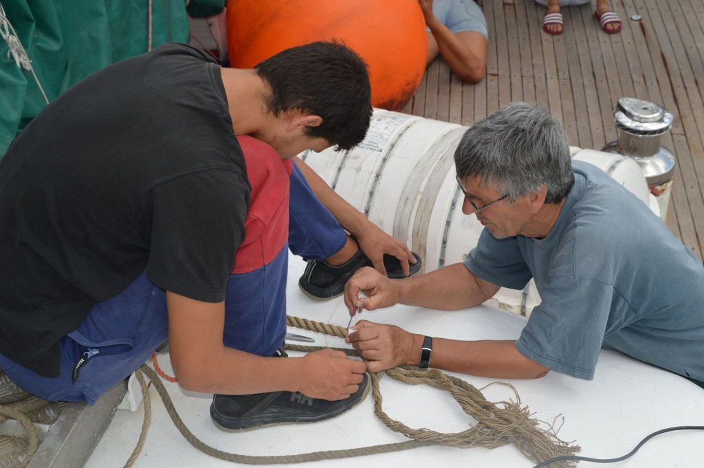 Weil ich so gerne Blog schreibe kommt hier noch ein Beitrag von mir: Für unsere Zeit hier vor Anker planen wir mit unserem Kapitän intensivere und regelmäßige Instandhaltungsarbeiten an der Johnny. Deshalb standen sowohl gestern als auch heute einige Schiffsarbeiten an. Gestern Vormittag haben ein paar Leute das Groß genäht. Außerdem wurde der Klüver II abgeschlagen und eingepackt, die Segellast wurde neu gestaut und das Sonnensegel vorne gesetzt. Heute gab es unter anderem Arbeiten an unserem Tauwerk und an den Bulleyes in der Messe. Da ich in dieser Zeit Unterricht auf dem Vorschiff hatte, habe ich für genauere Informationen Cle, Fredo und Emil interviewt.