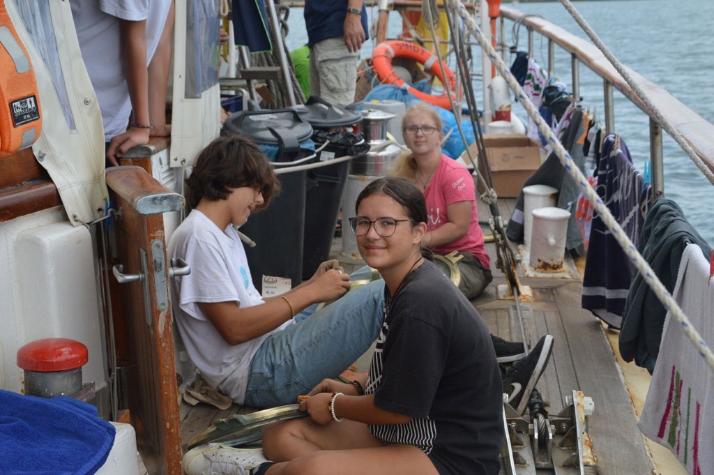 Sowohl heute als auch gestern Nachmittag waren wir am Nachmittag schwimmen. Es wurde wie immer viel getunkt und gesprungen. Außerdem gab es eine Challenge, wer es schafft am weitesten das Klüverstag hochzuklettern. Hippo ist am weitesten gekommen, aber Raphael hat ihm auch große Konkurrenz gemacht. Wir haben uns auch zu acht nebeneinander an den unteren Teil des Klüverstags gehangen. Jeder hat einen Klimmzug gemacht und dann sind wir ein Stückchen weiter das Stag hochgehangelt. Die Klimmzüge wurden mit jedem Mal schwerer, weil man den Körper immer weiter aus dem Wasser rausheben musste. Wenigstens haben wir mal wieder ein bisschen Sport gemacht!