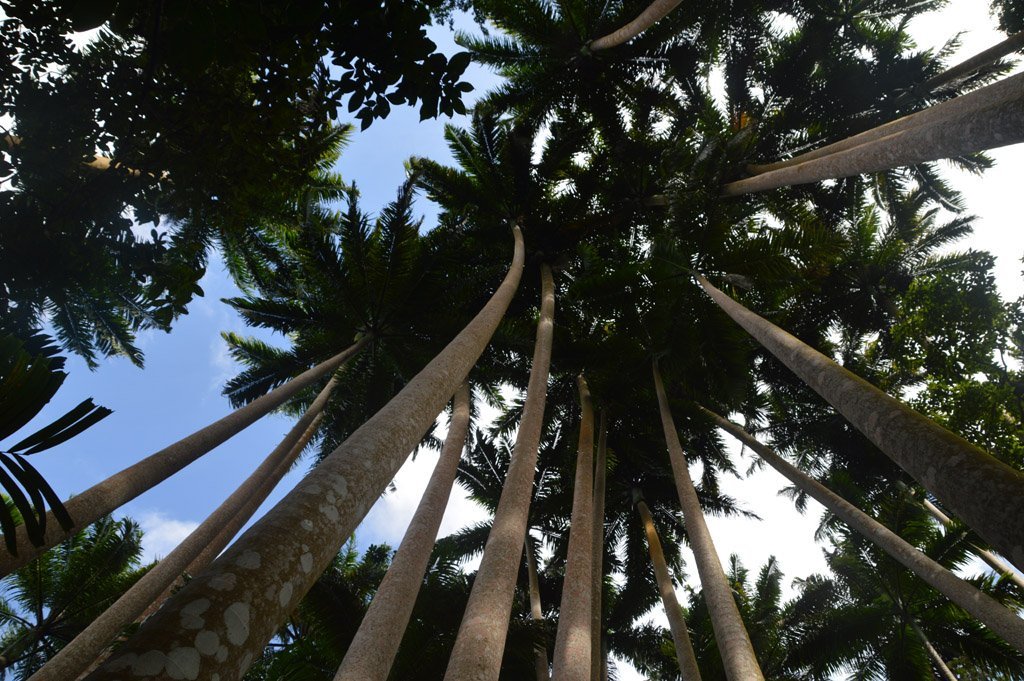 Also nun zum Regenwald. Bei unserer Ankunft wurden wir von Mahmood Patel empfangen. Mahmood oder Mood, wie er sich selbst nennt, hat sich vor 7 Jahren das Ziel gesetzt, den Regenwald von Barbados aufzuforsten. Anders als erwartet, gibt es in Barbados nämlich kaum noch Primärurwald, da die Briten, deren erste „Entdeckung“ in den kleinen Antillen Barbados war, praktisch alles rodeten um Zuckerrohr-Plantagen zu errichten. Mood, der eigentlich Hotelbesitzer hier auf der Insel ist, begann die etwa zweistündige Führung an seinem Gewächshaus, wo er Pflanzen, die er und sein Freund später in den Wald pflanzen, kultiviert. Danach führte er uns vorbei an Ingwer, Kurkuma und unzähligen anderen Pflanzen hin zum letzten Primärurwald auf der Insel (erkennbar an den indigenen Baumfarnen). Die unbeschreibliche Szenerie war geprägt von scheinbar unzählbar vielen Royal Palms, die tatsächlich mehr oder weniger hohl sind, um gegen Stürme gerüstet zu sein. Unsere Reise ging weiter, entlang an baumgroßem Bambus und einem Meditationstempel, der sich von Bambus umringt ab vom Weg findet.