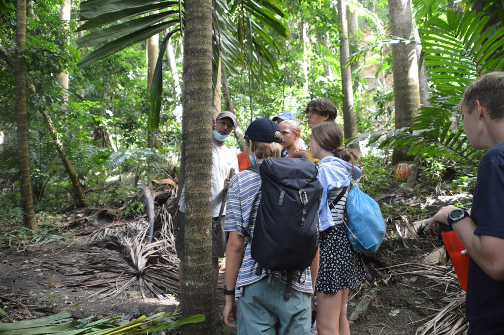 Schon kurz darauf erreichten wir den neu „angepflanzten“ Urwald. Mood erklärte uns auf einem Plateau, wie er versucht durch stufenweise Bepflanzung sein Projekt „integrated farming“ voranzutreiben und der auf Barbados vorherrschenden Monokultur entgegenzuwirken. „Integrated Farming“ bedeutet, dass Mood in den bereits vorherrschenden Urwald seine Obstbäume und andere Pflanzen eingliedert, sodass der Urwald keinen Schaden nimmt. Von dieser Permakultur profitiert auch die Tierwelt (z.B. die indigenen „Green Monkeys“). Was vor 7 Jahren als Projekt begann, mit dem Mood Kokosnüsse für seinen Eigengebrauch anbauen wollte, ist heute zu einer Lebensaufgabe geworden. Vor lauter Begeisterung für den Regenwald, für Moods ambitionierter Arbeit und nicht zuletzt, weil er uns im Zuge seines Wunsches einen Ökotourismus, von dem beide Seiten profitieren, zu errichten, nahmen wir mit Freude das Angebot an, bei unserem nächsten Besuch, mit ihm ein paar Bäume in den Urwald zu pflanzen. Nach so einem ereignisreichen Tag möchte man meinen, dass der Rückweg völlig ereignislos sein würde, aber nein, denn es begegneten uns etwa 20 „Green Monkeys“ auf dem Weg. Wieder im Camp angekommen, mussten wir uns schon wieder ausgehbereit machen, denn wir ließen den Abend bei Steve in der Surfer‘s Bar mit köstlichem Essen in fantastischer (Strand-)Bar-Atmosphäre ausklingen.