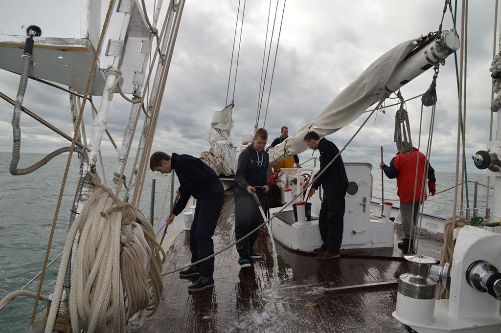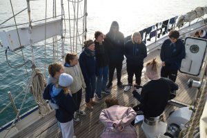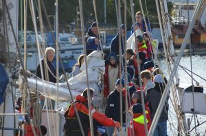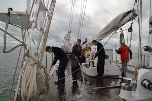 Dann hieß es erstmal Segelbergen, denn zur Überraschung von uns allen durften wir gestern schon in den Hafen (von Barbados) einlaufen. Wir haben also erst die Breitfock geborgen und dann das Try-Segel. Auf einmal hat’s ganz schön angefangen zu schütten und wir wurden alle klitsche-nass, aber auch das konnte unsere Stimmung nicht trüben! Wir haben uns dann fürs Anlegemanöver fertig gemacht, das heißt Fender bereithalten und Festmacherleinen klarlegen. Im Dunklen sind wir dann in den Hafen eingelaufen. Beim Anlegemanöver heißt es immer höchste Konzentration. Jeder hat seinen Posten. Achterleine, Achterspring, Mittelspring, Vorleine und Vorspring müssen mit Hilfe einer Wurfleine an Land gebracht werden. Achtern stehen Rudergänger*in, Kapitän und Maschinist am Steuerstand. Der Kapitän gibt die Kommandos, welche der/die Rudergänger*in dann ausführt. Er sagt dann sowas wie „Steuerbord 5“, woraufhin der/die Rudergänger*in das Steuer auf 5 Grad Steuerbord legt.
