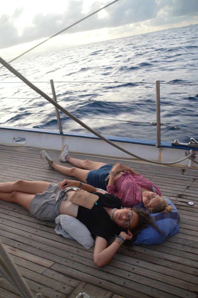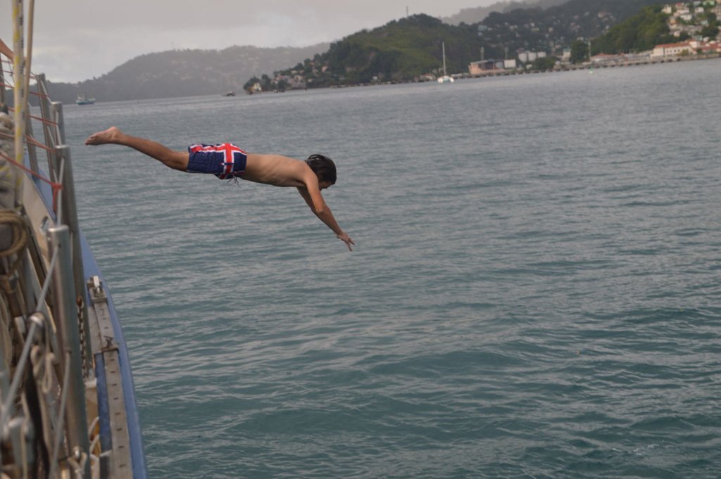 In dieser Zeit werden wir vormittags alle zusammen Unterricht machen und uns nachmittags um das Schiff kümmern (wir lernen einen kleinen Riss im Großsegel zu nähen und werden andere kleinere Arbeiten erledigen), sowie weitere von uns vorbereitete Referate über die Karibik (z.B. „Flora und Fauna unter Wasser“, „Klima und Wetter (-phänomene) der Karibik“ oder „Kampf der Platten und wie die Karibik entstanden ist“ anhören. Die Backschaft leistete heute ehrlicherweise einen Haufen Arbeit, denn unsere Dönerbude mit Ali, Mohammed und Aischa (alias Anabel, Julius und Robert) bereitete uns heute Mittag Döner, der allen sehr gut geschmeckt hat. Den restlichen Tag verbrachten wir damit, vom Klüvernetz zu springen, endlich in der Karibik zu schwimmen und uns ordentlich auszutoben. Außerdem übten wir weiter für den Motorbootführerschein, indem wir mit Begleitung von Michael alleine das Dinghi fuhren, was einen Riesenspaß macht. Es war auch sehr interessant die Johnny mal von unten – also aus dem Wasser oder vom Dinghi aus – zu sehen. Die Stimmung an Bord ist allgemein sehr entspannt.