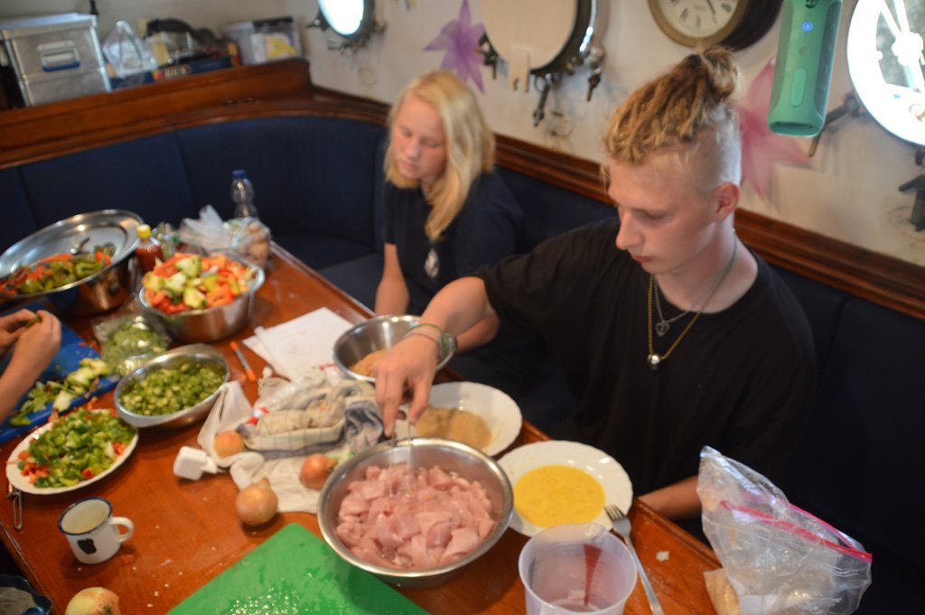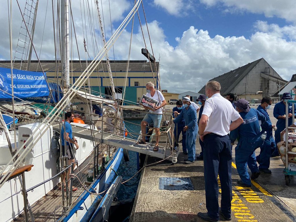 Der 24. Dezember 2020 war ein wunderschöner Tag, an dem unsere Bordgemeinschaft sogar Geschenke von überraschender Seite bekam, nämlich bekamen wir einen mehrere Meter hohen Vorrat an Obst und Gemüse von dem Kreuzfahrtschiff, das neben uns im Hafen lag, geschenkt. An dieser Stelle nochmal ganz herzlichen Dank von uns allen an euch, insbesondere an Stig Nielsen, den Kapitän der Carribean Serenada of the Seas! Auch wenn es ein schönes Weihnachten war, war es sehr stressig, denn ein so schön improvisiertes Weihnachten erfordert natürlich jede Menge Vorbereitungen. Es musste ein gigantisches Buffet vorbereitet werden, dafür nochmal ganz lieben Dank an Jan, Cle, Johannes, Emil, Anabel, Fredo, Clara und natürlich unsere zwei Backschaftsmonster Koko und Noah. Dazu haben Fredo, Timana und Emil ebenso den vorderen Mast in ein Leuchtfeuer aus Dekorationen, Lichterketten und weiterem Weihnachts-Schnickschnack in den wohl schönsten Ersatz-Weihnachtsbaum verwandelt, den ich je gesehen habe.
